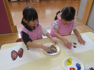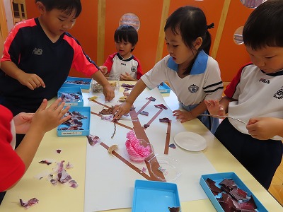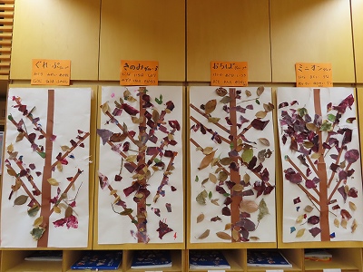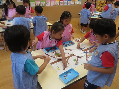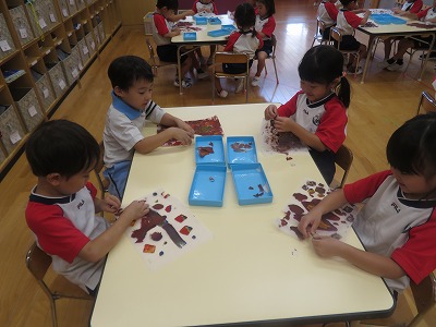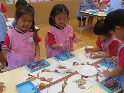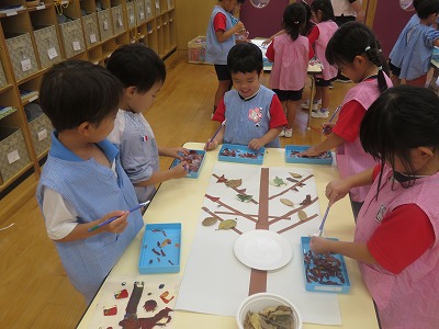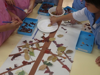 トレーシングペーパーを落ち葉や季節の生き物に見立ててちぎり