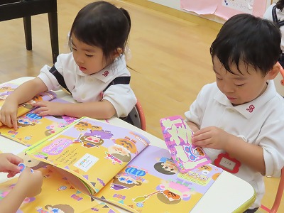 「先生見て~かわいいでしょ♡」と帽子を貼ったり、ステッキを貼ったりして楽しみました(^▽^)/