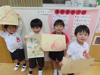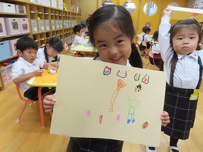 「玉入れを描いているんだ~」や「日本描いてる!、「パパとかけっこしたんだ~」と