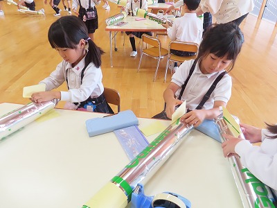 紙で作ったおもりを先端に巻き付けると