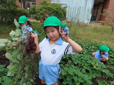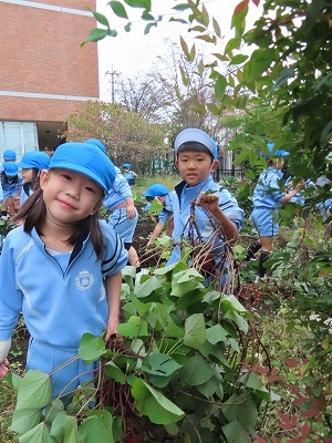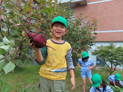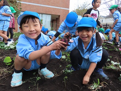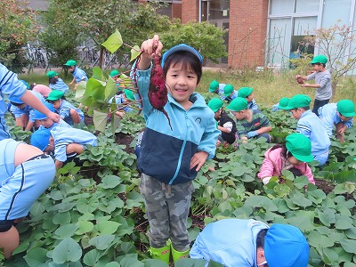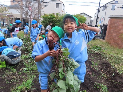 自分の見つけたさつまいもを友だちと見せ合いながら