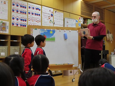 歌を歌うだけでなく、イラストを見て単語を答えたり、英語で先生方が読む紙芝居を見たり…