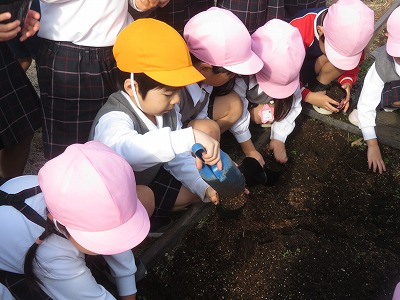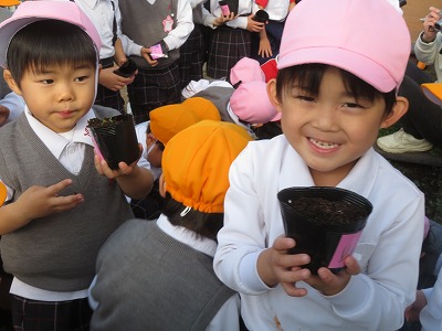 ☆そらまめの種植え☆ 今日はそらまめの種を植えました☀ そらまめってどんな形かな? 「小さな丸い形だと思うよ!」「ハートに見えるね!」 と興味津々の子どもたち! 土をポットにたっぷり入れて、優しく植えていきます。 芽が出たら大きな畑にお引っ越しする予定です♪ ポットに自分の名前を書いて1人1つ種を植えました! 芽が出てくるのが楽しみだね(*^^*) 大切に育てようね☆彡