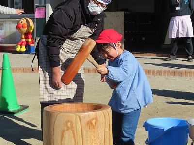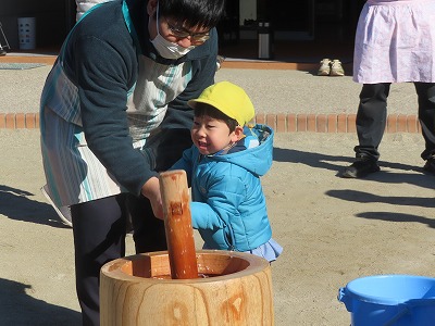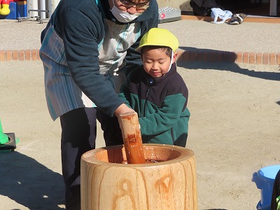 「よいしょ!よいしょ!」と見ているお友だちからの応援パワーをもらって力強くお餅をついていきます‼