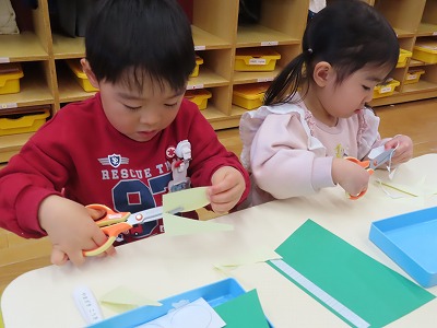 はさみではなく、紙を動かしながら切ることを頑張っている子どもたちです(^▽^)/