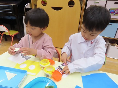 「先生!お母さん指でのりを付けるんだよね!」や「周りに付けていくんでしょ~」と