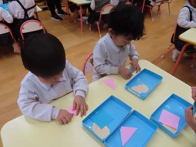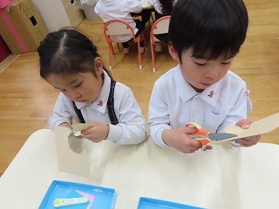 今回のひな祭りの製作では、はさみ、のり、クレヨン、折り紙、スタンプと