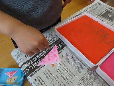 次に、大人気の指スタンプをして、着物に模様をつけていきました‼