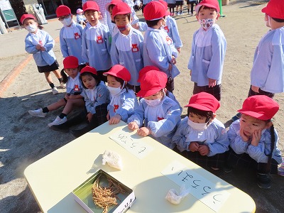 登園する時に園庭に準備してあるかまどや杵、臼を見て