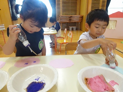 季節の製作であじさいを作りました!! 小さな花のスタンプであじさいの花を咲かせていきます🌸 次は、絵具のついたビー玉を転がして 雨を降らせていきます☔ お友だちがやっているのに興味津々✨ とてもきれいなアジサイが咲きました♪