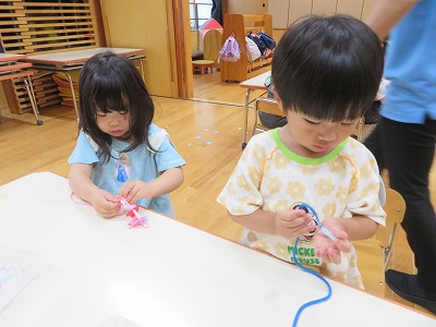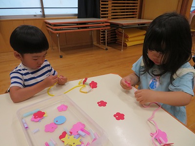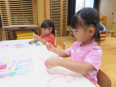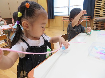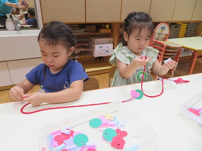 ひよこクラブ🐤 【月・水・金コース】 9/5 ☆紐とおし☆ 今日は紐通しをしてみました! 最初はなかな難しそうでしたが 集中して慣れてきたら どんどん通していきました♪ 素敵なネックレスが出来上がりましたね❤