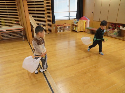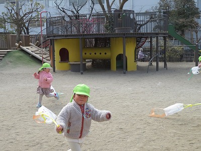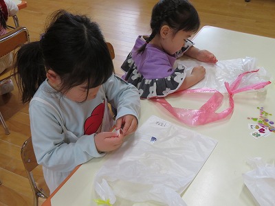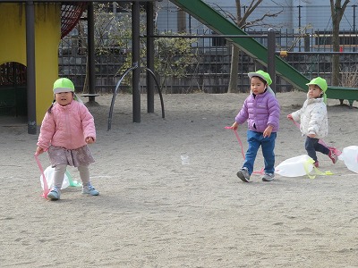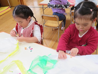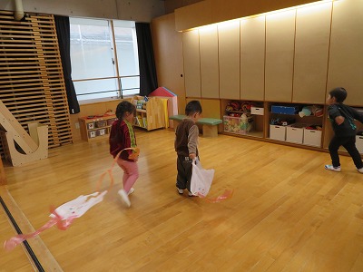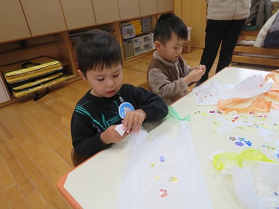 ひよこクラブ🐤 1/19 【月・水・金コース】 ☆たこ作り☆ ビニール袋に シールを貼って尾ひれを 付けたら出来上がりです。 沢山シールを貼って カラフルな凧が出来ましたね! 外に出て 凧を飛ばしました。 元気よく上がりました。 1/20 【火曜日コース】 風が強いので 室内で飛ばしてみました。
