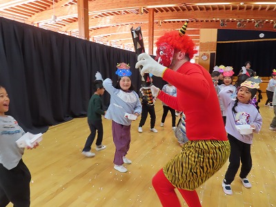 学年ごとにホールで豆まきをしました!