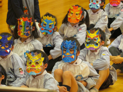 今日は節分。幼稚園では豆まきを行いました☆ 事前に作った鬼のお面をつけて、豆まきに出発です!! 最初は意気込んでいた子ども達も、鬼の登場にちょっとびっくり(>_<) 泣いてしまう子もいましたが、みんなで元気に 「鬼は外!福は内!」 無事に鬼も逃げていき、退治することができました☆ 今年も一年元気に過ごせますよーに♡