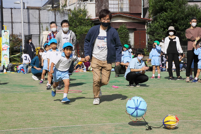 つながった大小二つのボールを親子で蹴っていきます!