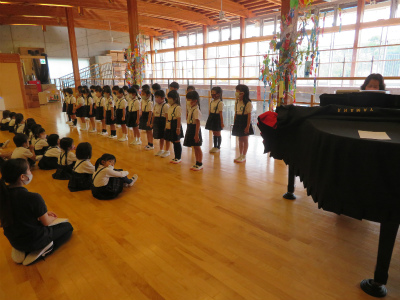 今日は七夕まつり子ども会がありました(^^♪ 学年ごとに歌をうたいました♪ 元気よく上手にうたうことができました☆ 最後の七夕についての○×ゲームはとても盛り上がりました! 難しい問題にも正解することができて 嬉しそうな子どもたちでした^^♪ おやつは、星型のおせんべいでした☆ みんなのお願い事が叶いますように・・・^^♪