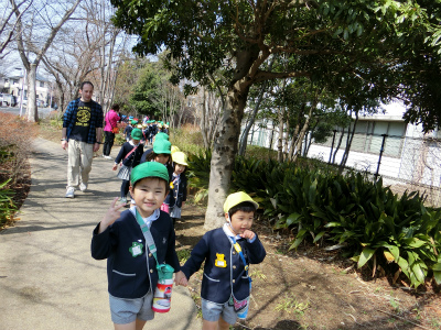 会の後は、お散歩に出かけました。年長組と年少組で手をつないでお話をしながら楽しそうに